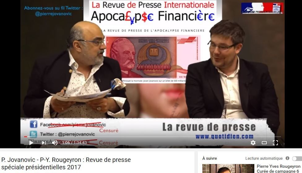 Photo : j'ai extrait cette image de la vidéo. Revue de presse spéciale élections présidentielles 2017. Avec Pierre Jovanovic et Pierre-Yves Rougeyron...