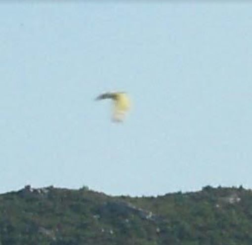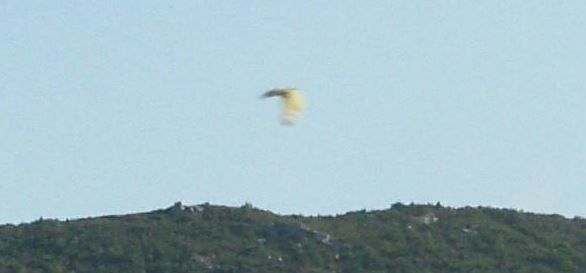 "...Je voulais te parler d'un objet triangulaire que j'aie pris l'année dernière dans la lumière du soleil. Il est descendu et je l'ai eu en photo. Je n'ai rien dit car l'affaire était sérieuse et l'objet est repassé pas loin de chez moi avec l'aile en feu. J'ai eu le temps de prendre la photo. En fait, j'ai eu peur de te les envoyer car il y a eu une bataille aérienne dans la lumière du soleil. Ce jour là, je n'avais pas mes lunettes de soleil et j'ai pris une photo en direction du soleil par intuition et j'ai attrapé l'objet. Plusieurs engins étaient engagés dans cette bataille.